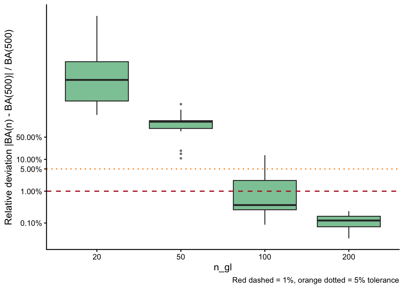 | n_gl | N: median dev. | N: max dev. | BA: median dev. | BA: max dev. |