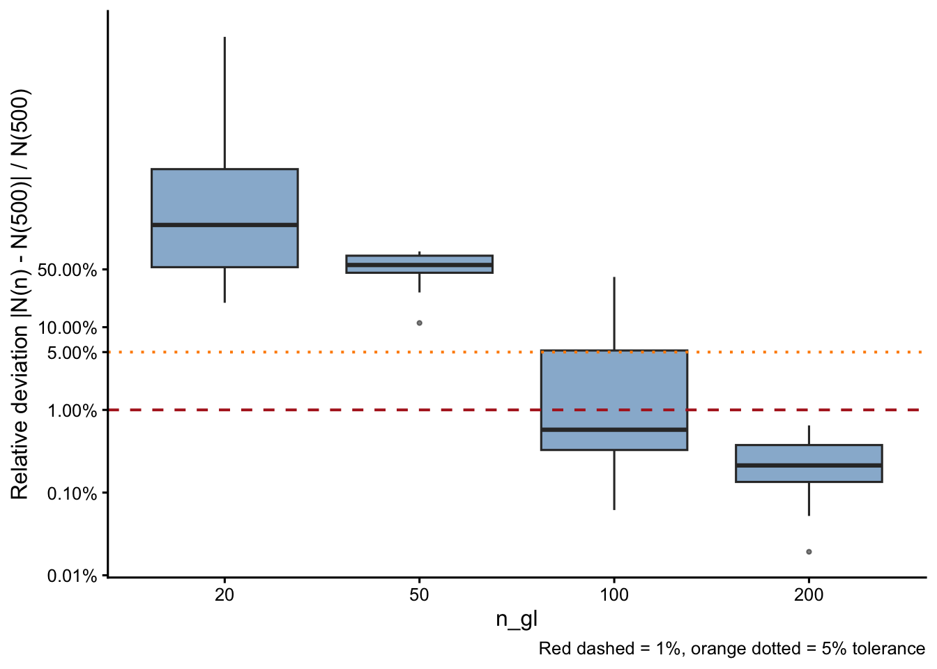 | n_gl | N scenarios | Pass (< 5%) | % Pass | Max dev. | Median dev. |