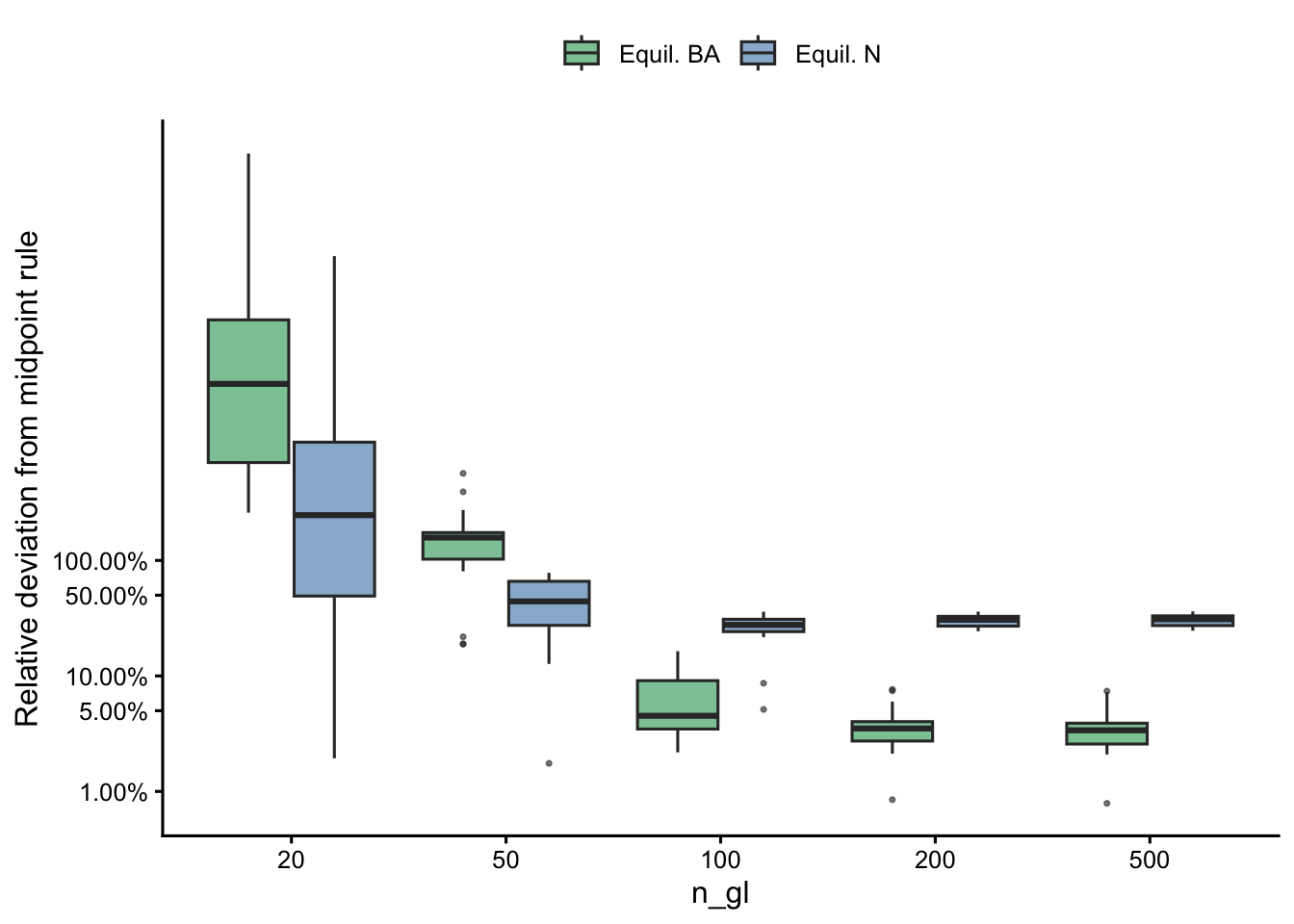 The \(x_i^2\) term down-weights small trees and up-weights large trees. The large-tree region is where GL weights and midpoint weights are most similar (the midpoint bins are fine enough to approximate GL there), so the \(x^2\)-weighted integral is less sensitive to the quadrature scheme. As a result, the structural difference between GL and midpoint manifests more weakly in BA than in N.