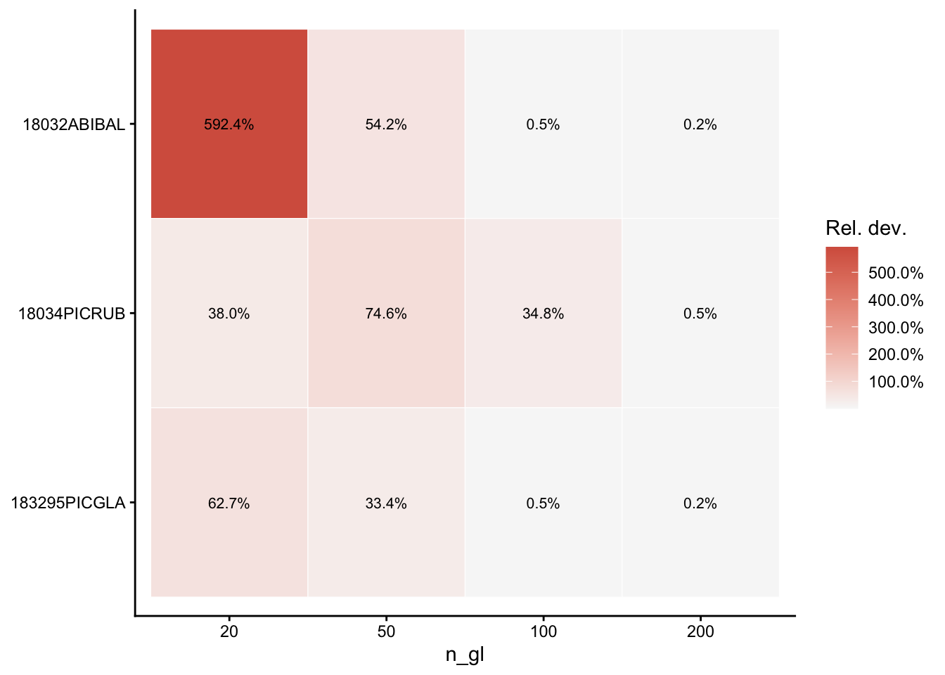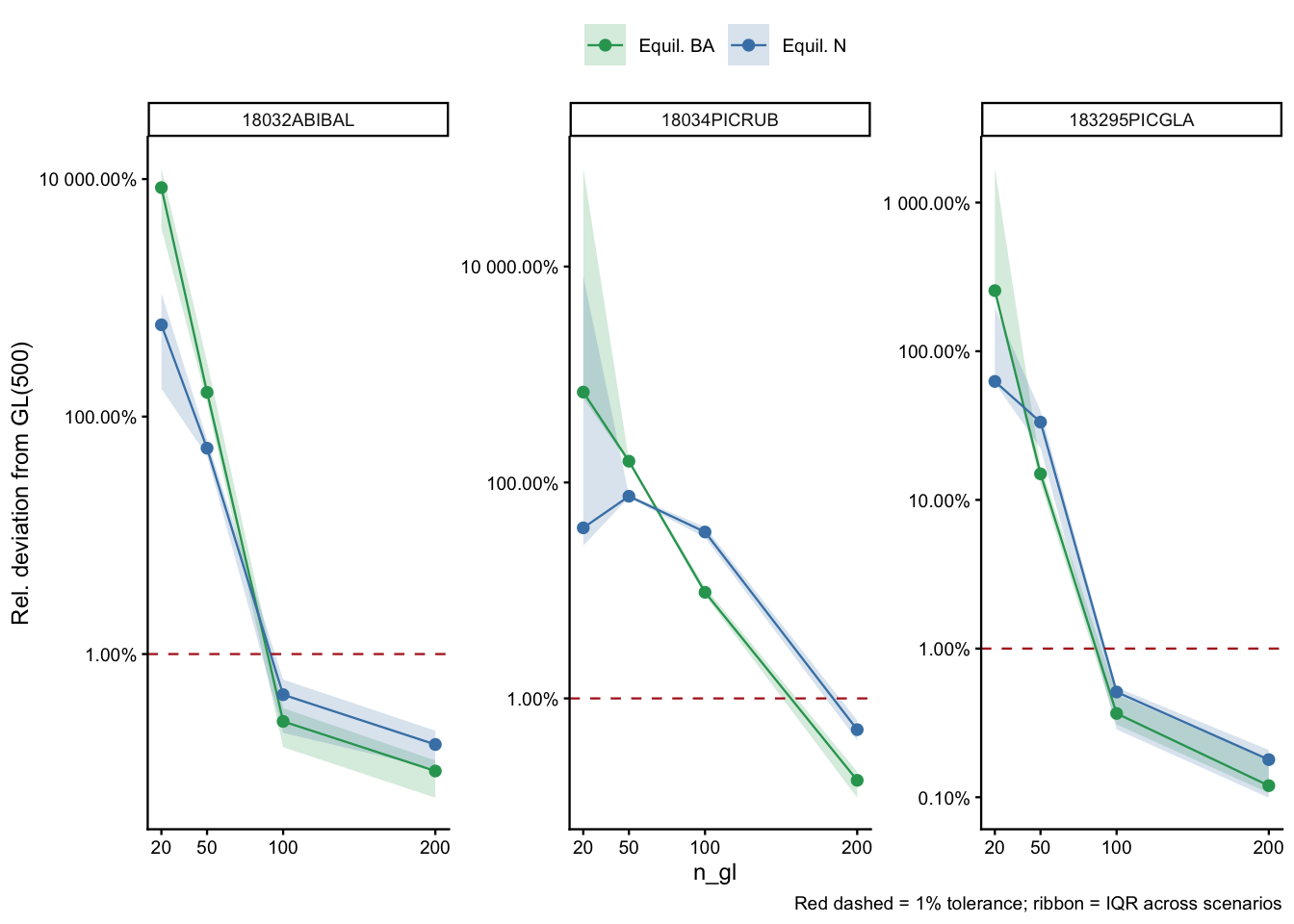 | Species | Min n_gl <1% (N) | Min n_gl <5% (N) | Dev @100 (N) | Dev @200 (N) | Min n_gl <1% (BA) | Min n_gl <5% (BA) | Dev @100 (BA) | Dev @200 (BA) |